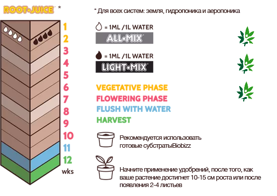 Дозировка и применение: производитель рекомендует дозировку 1—4 мл жидкого удобрения на литр воды или питательного раствора. Если вы используете субстраты Biobizz All Mix или Light Mix, лучше всего удобрять растения раствором с добавлением Root Juice на протяжении 1-2 первых недель, поскольку это самое важное время для формирования корней.